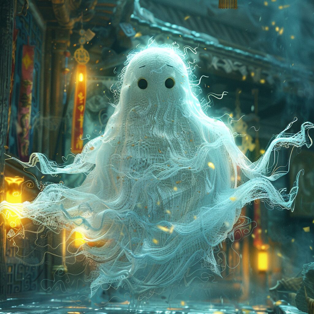 Bir vakitler bir adam dar bir dağ yolunda yürürken bir hayalete rastlamış. Hayalet çabucak dönüp adamın yanında yürümeye başlamış. Adam çok korkmuş ancak bunu hayalete aşikâr etmek istememiş. Çok geçmeden geçilmesi gereken bir ırmağa gelmişler ve köprü ya da tekne olmadığı için ikisi de ırmağı yüzerek geçmek zorunda kalmışlar. Elbette adam suda kulaç atıp su sıçratarak hayli gürültü çıkarmış, hayalet ise hiç ses çıkarmamış.
