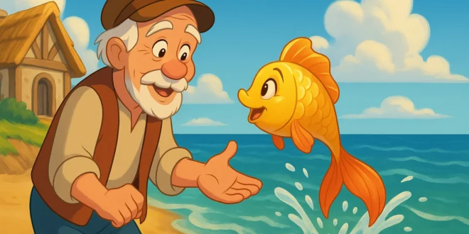 Bu, sıradan bir balık değildi; kuyruğu altından, pulları elmastanmış gibi parlıyordu. Balık, dile geldi ve “Ey yaşlı adam,” diye yalvardı, “Lütfen beni denize bırak. Ne dilersen senin için yaparım!”