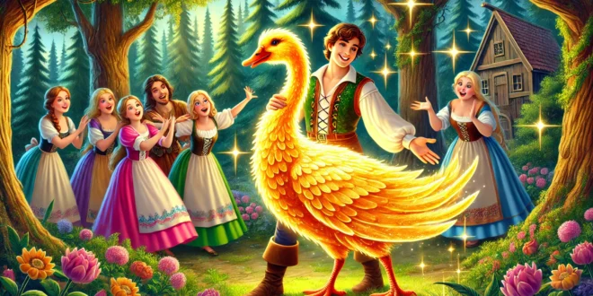 Şapşalcık ağacı kestiğinde, köklerin arasında tüyleri tamamen altından olan bir kaz buldu. Kazı alıp geceyi geçireceği hana gitti. Hancının üç kızı, altın kazı görünce ondan bir tüy koparmak istediler. En büyük kız, Şapşalcık dışarıdayken kazın kanadını tuttu, ancak parmakları kazın tüylerine yapıştı ve kurtulamadı. Ortanca kız ablasına yardım etmek istedi, ancak o da ablasına dokunur dokunmaz yapıştı. En küçük kız da aynı şekilde onlara yardım etmeye çalıştı ve o da yapıştı.