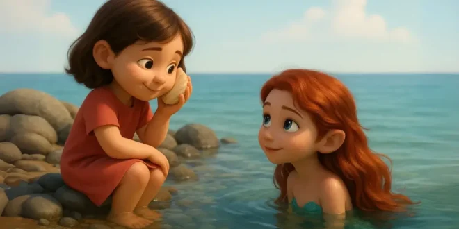 Bir sabah, Mavi kıyıya gerçek yüzmüş. Deniz sessiz, gökyüzü pırıl pırılmış. Suyun çabucak kenarında, taşların üzerine oturmuş küçük bir kız dikkatini çekmiş. Kız elinde bir deniz kabuğu tutuyormuş ve ona bakarak fısıldamış: “Bu kabuk deniz kızlarına gitsin.” Sonra yavaşça gülümseyip kabuğu suya bırakmış.