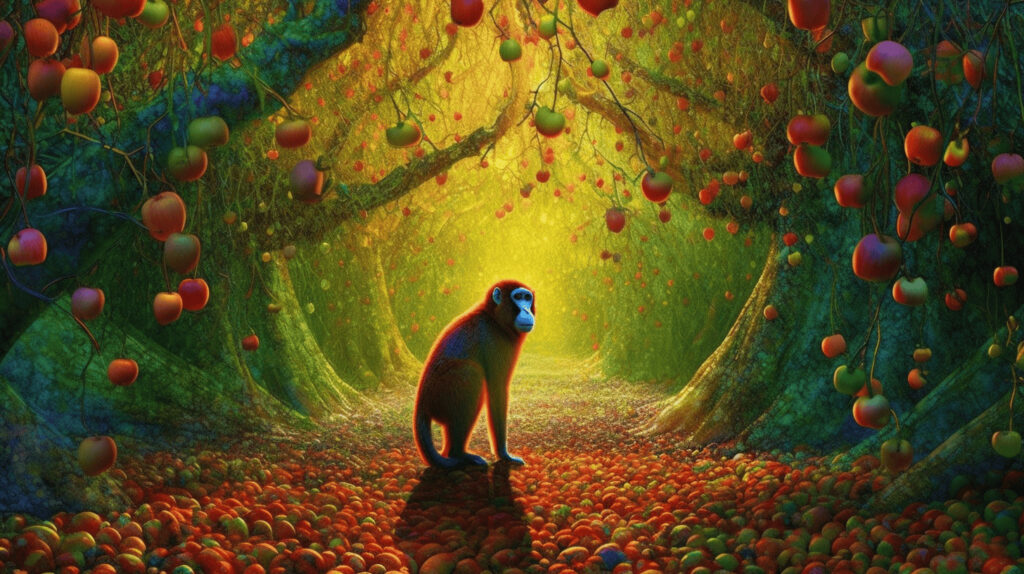 Sabah mümkün olduğunca çabuk uzaklaştık ve üçüncü bir adaya geldik. Etrafta yiyecek ararken, kırmızı elmaya benzeyen meyvelerle dolu bir ağaç gördük. Bir elma koparmak üzereyken bir sesin “Bu ağaca dokunmayın; o hükümdara ait” dediğini duyduk. Akşama hakikat bizi gördüklerine çok şad olmuş görünen birkaç maymun geldi ve yiyebileceğimiz tüm meyveleri bize getirdiler.