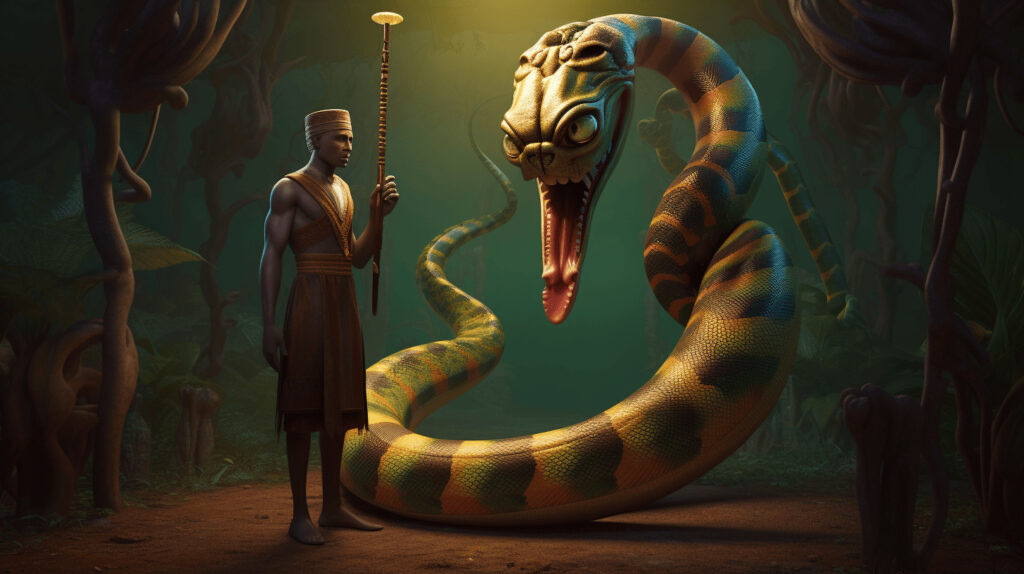Böylece onları yılanların hükümdarının konutuna götürdü. Kral onu görünce, “Beni öldürmek için geri geleceğini söylememiş miydim?” dedi.