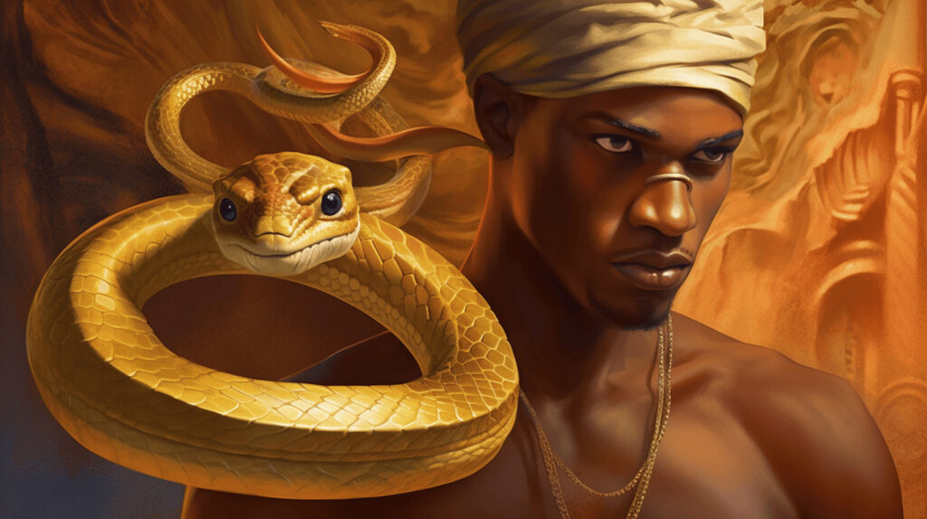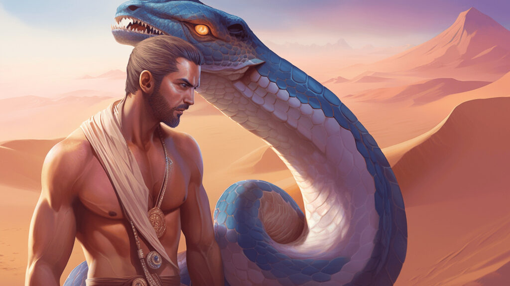 Bir mühlet sonra kendisini kanepeden kaldırılıp bir sandalyeye oturtulurken buldu ve birinin şöyle dediğini duydu: “Ona ziyan vermeyin; nazikçe uyandırın.” Gözlerini açtığında kendisini, içlerinden biri hoş kraliyet renkleri taşıyan çok sayıda yılanla çevrili buldu.