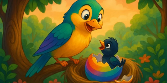 Bir sabah erkenden uyanan Renkkanat, yuvasının hemen yakınındaki çimenlikte parlayan bir şey fark etti. Merakla yaklaştığında gözlerine inanamadı. Orada, top gibi yuvarlak, ışıl ışıl parlayan renkli bir yumurta duruyordu. Üzerinde ince desenler vardı, sanki gökyüzüyle toprağın sırlarını taşıyordu.