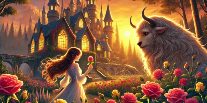 Tüccar, dönüş yolunda ormanda kayboldu ve fırtınadan korunmak için ıssız bir şatoya sığındı. Şatoda kimseyi bulamasa da, masada hazır yemekler ve rahat bir yatak buldu. Ertesi sabah, bahçede Güzel için bir gül kopardı. Ancak o anda korkunç bir canavar ortaya çıktı ve ona bağırdı: