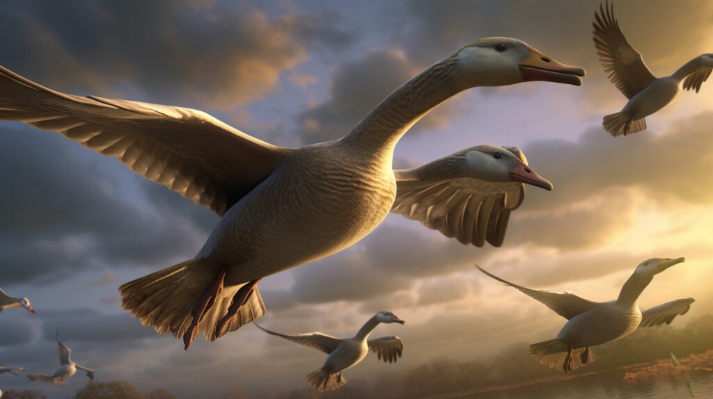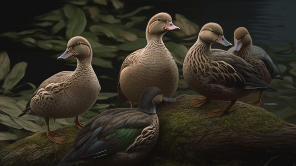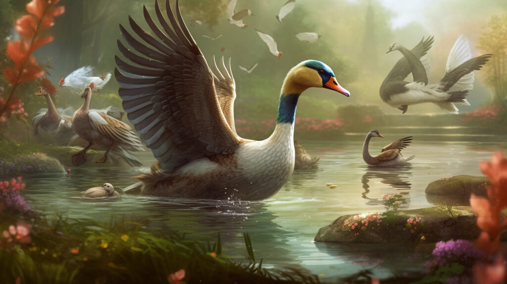 Bir küme yaban ördeği bataklıkta dans ediyor ve ziyafet çekiyordu. Kanatlarını uçtan uca açmış, geniş bir daire içinde aşağı üst hareket ediyorlardı. Halkanın içinde, küçük bir davulun etrafında, seçilmiş müzikçiler oturuyor, başlarını sallıyor ve gözlerini kırpıştırıyorlardı.