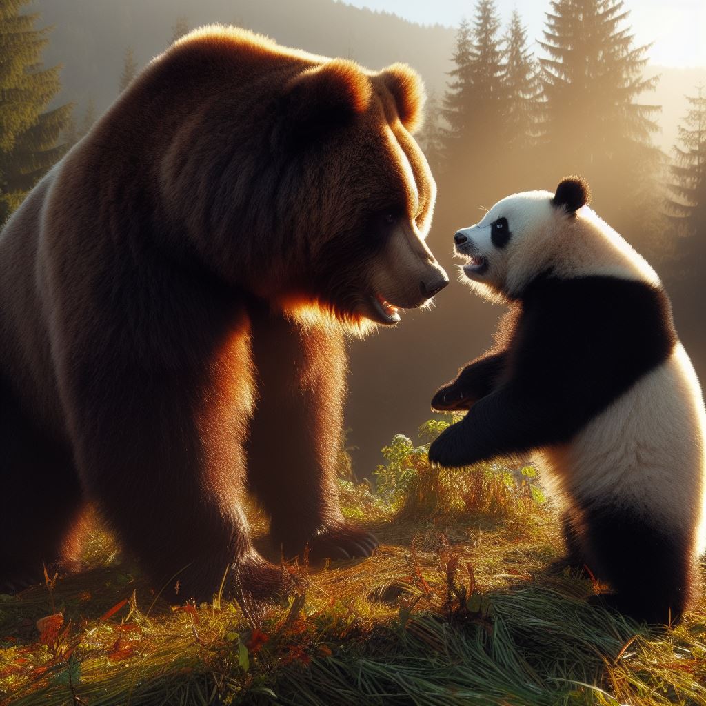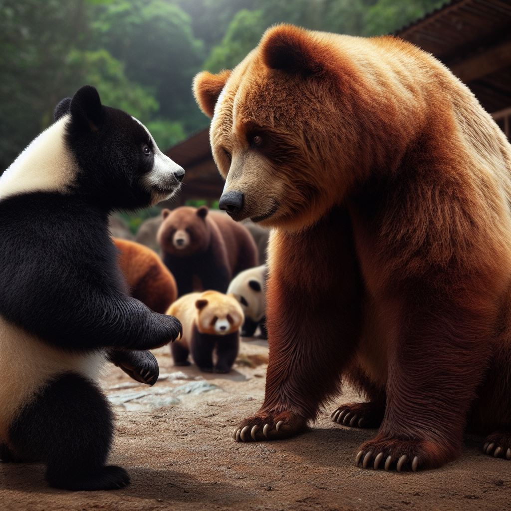 Bir gün kahverengi panda ormana dolaşmaya çıkmış, yağışlı bir havada yürürken karşıda bir ayı görmüş ve kıpırdamamaya çalışmış. Zira ses yaparsa kendisine ziyan verebilirmiş. Ayının kulakları düzgün duyuyormuş çalılardan gelen sesi duymuş. Panda çalılara saklanmış. Ayı yavaş yavaş çalılara hakikat gelmeye başlamış. Panda bir anda kendini göstermiş,