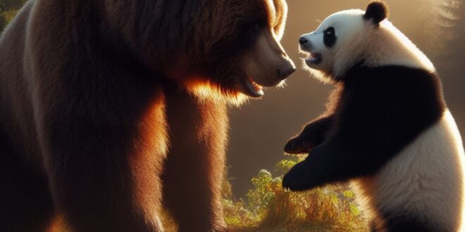 Bir gün kahverengi panda ormana dolaşmaya çıkmış, yağışlı bir havada yürürken karşıda bir ayı görmüş ve kıpırdamamaya çalışmış. Zira ses yaparsa kendisine ziyan verebilirmiş. Ayının kulakları düzgün duyuyormuş çalılardan gelen sesi duymuş. Panda çalılara saklanmış. Ayı yavaş yavaş çalılara hakikat gelmeye başlamış. Panda bir anda kendini göstermiş,