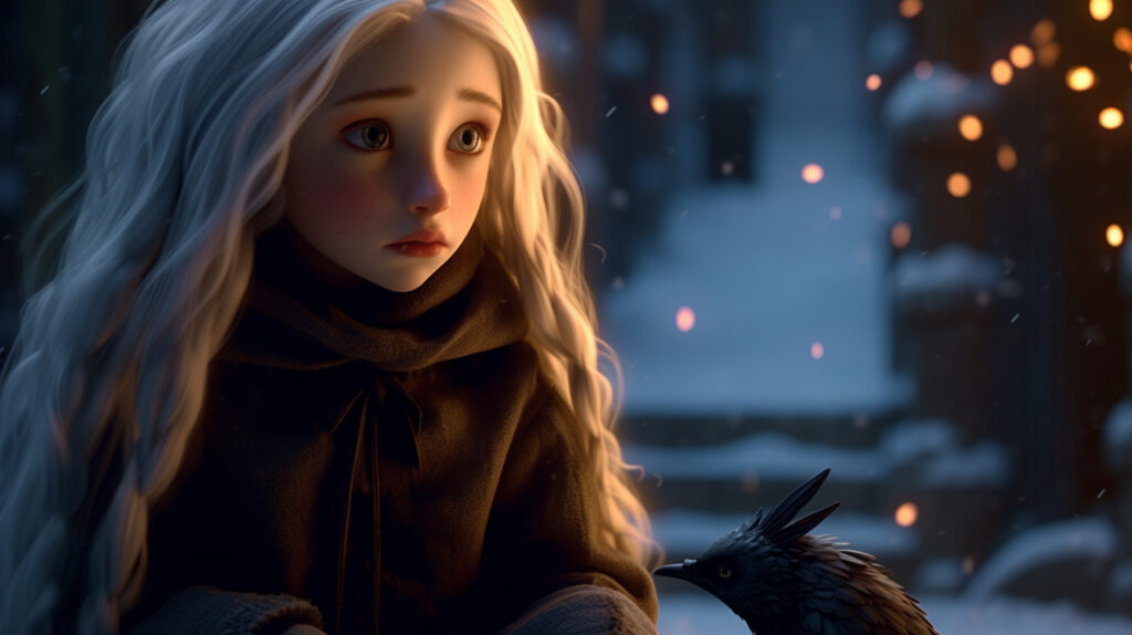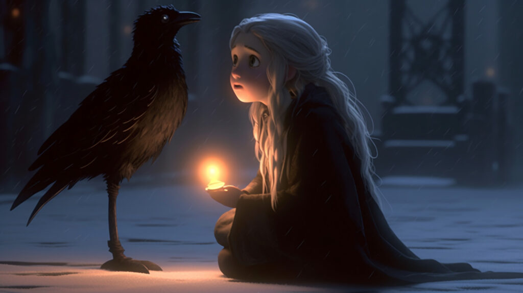 Şimdi merdivenlerdeydiler ve en üstteki küçük dolapta bir lamba yanıyordu. Yerin ortasında evcil karga durmuş, başını iki yana çevirmiş, büyükannesinin öğrettiği üzere reverans yapan Gerda’ya bakıyordu.