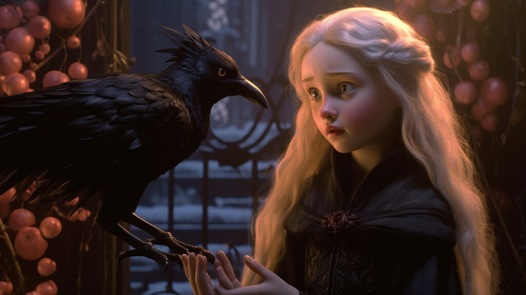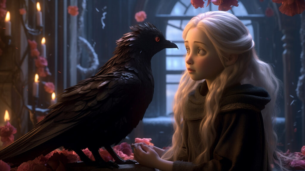 “Bunu istemek çok kolay,” diye yanıtladı karga, “ama bunu nasıl başaracağız? Tekrar de bu mevzuyu biricik sevgilimle konuşup ondan tavsiye isteyeceğim, zira sana söylemeliyim ki, senin üzere küçük bir kızın saraya girmesi için müsaade almak çok güç olacak.”