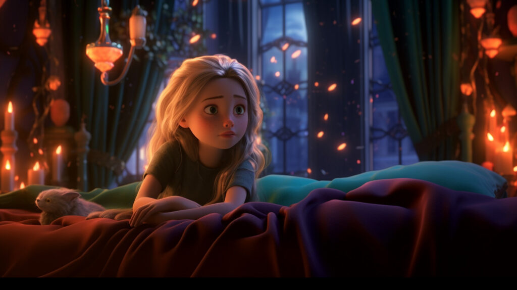 Sonunda bir yatak odasına ulaştılar. Tavan büyük bir palmiye ağacını andırıyordu, en kıymetli kristalden cam yaprakları vardı ve tabanın ortasında, her biri zambağa benzeyen iki yatak, altından bir sapa asılmıştı. Prensesin yattığı yataklardan biri beyaz, oburu kırmızıydı. Gerda küçük Kay’i bu yatakta aramak zorunda kaldı.