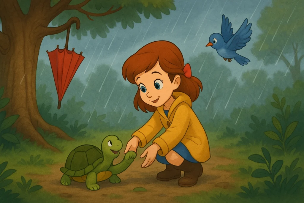 Ormanda ilerlerken, yere düşmüş bir kaplumbağa görmüş. Kaplumbağa ters dönmüş ve kalkamıyormuş. Mina hemen eğilip onu çevirmiş. Kaplumbağa gülümseyerek, “Kırmızı bir şemsiye şu ağacın dalında asılıydı, ama sonra bir kuş aldı,” demiş.