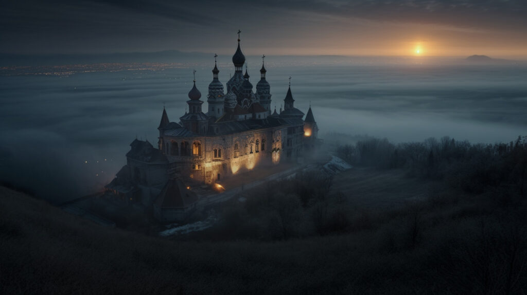 Her tarafta yanan meşaleler taşıyan grotesk cüceler belirdi, selam verdiler ve Hükümdarları Kovlad’ı karşıladılar, onun ve beraberindekilerin yolunu aydınlattılar. O vakit kız birinci sefer Kovlad’la evlendiğini anladı lakin bu onun için pek kıymetli değildi. Bu kasvetli geçitlerden açık havaya çıktıklarında kendilerini büyük ormanlar ve dağlarla, gökyüzüne değen dağlarla çevrili buldular. Ve ne gariptir ki ne cinsten olursa olsun tüm ağaçlar ve hatta gökyüzüne değiyormuş üzere görünen dağlar bile som kurşundandı. Bu süper dağları aştıklarında, dev Zémo-tras geçtikleri yoldaki tüm açıklıkları kapattı.