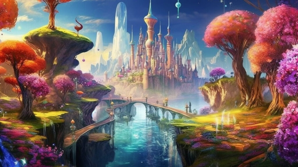 Kalenin dışında, içinde parlak kırmızı ve koyu mavi çiçeklerin ve ateş alevleri üzere çiçeklerin yetiştiği hoş bir bahçe vardı; meyveler altın üzere parlıyordu ve yapraklar ve saplar daima olarak sağa sola sallanıyordu. Toprağın kendisi en ince kumdu, lakin yanan sülfür alevi üzere maviydi. Her şeyin üzerinde kendine mahsus mavi bir parlaklık vardı, güya denizin karanlık derinlikleri yerine mavi gökyüzü hem üstte hem de aşağıda her yerdeydi. Sakin havalarda güneş görülebiliyordu, kaliksinden ışık akan kırmızımsı mor bir çiçeğe benziyordu.