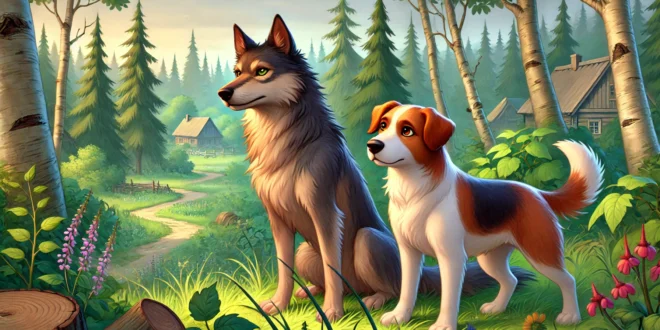 Bir zamanlar, ormanın derinliklerinde yaşayan zayıf ve aç bir kurt, yiyecek bulmakta zorlanıyordu. Günlerdir avlanamayan kurt, iyice bitkin düşmüştü. Bir gün, köyün yakınlarına kadar geldi ve burada, tüyleri parlak, sağlıklı ve tok bir köpekle karşılaştı. Köpeğin bu hâline imrenen kurt, ona yaklaşıp sordu: