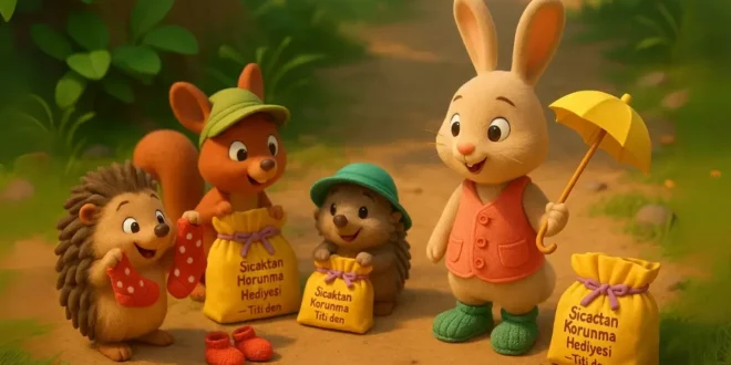 Ertesi sabah, hayvanlar yuvalarının önünde küçük paketler bulmuş. Her birinin üstünde “Sıcaktan Korunma Hediyesi” yazıyormuş. Merakla paketleri açmışlar. İçlerinden şapkalar, patikler ve minik şemsiyeler çıkmış.