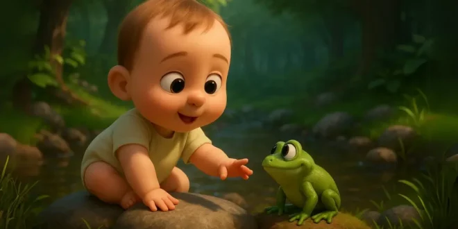 Tam o sırada, suyun içinden bir kurbağa zıplayarak taşın kenarına çıkmış. “Merhaba minik,” demiş gülümseyerek. “Su bazen konuşmaz ancak şıpırtısıyla oyun oynar.” Bebek elindeki taşı yere bırakmış, sonra sessizce suya bakmaya devam etmiş.