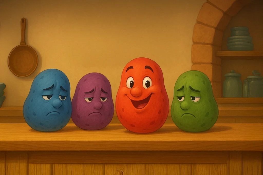 “Ben bu renkli patatesleri şehirde satarım!” demiş. Ama bir şartı varmış: Sadece kırmızı olanları almak istiyormuş.