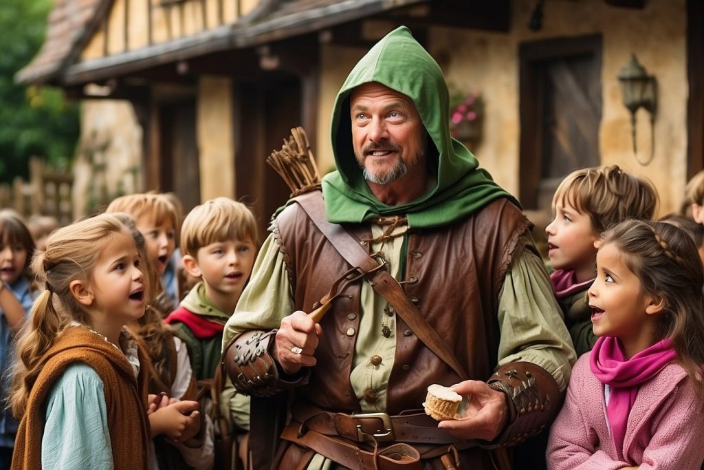 Robin Hood çocuklara bir vakitler diğer bir köyde yaşayan genç bir adamdan bahsetmeye başladı. Bu genç adama duyduklarına nazaran “Robin Hood” deniyor. Onun kıssası, bir kahramanın diğerlerine nasıl yardım ettiğini ve adalet için nasıl savaştığını anlatıyordu.