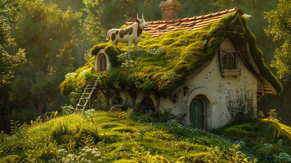 Ve adam yola koyulmuş, uzun bir yol kat etmiş ve sonunda çatısında ot bitmiş bir bayanın kulübesine gelmiş. Bayan ineğini merdivenden otların üzerine çıkarmaya çalışıyormuş lakin zavallı inek bir türlü çıkmıyormuş.
