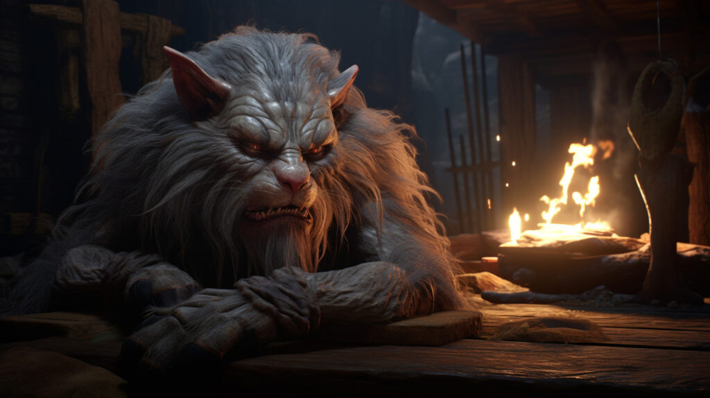 Yaşlı adam gecenin köründe, değirmen kulübesinin tabanındaki küçük ateşin yanında kıvrılmış yatarken ansızın uyanmış. Devasa, maymuna emsal bir yaratık zirvesinde dikilmiş, gürlüyormuş. “Sen kimsin ve burada ne arıyorsun?”